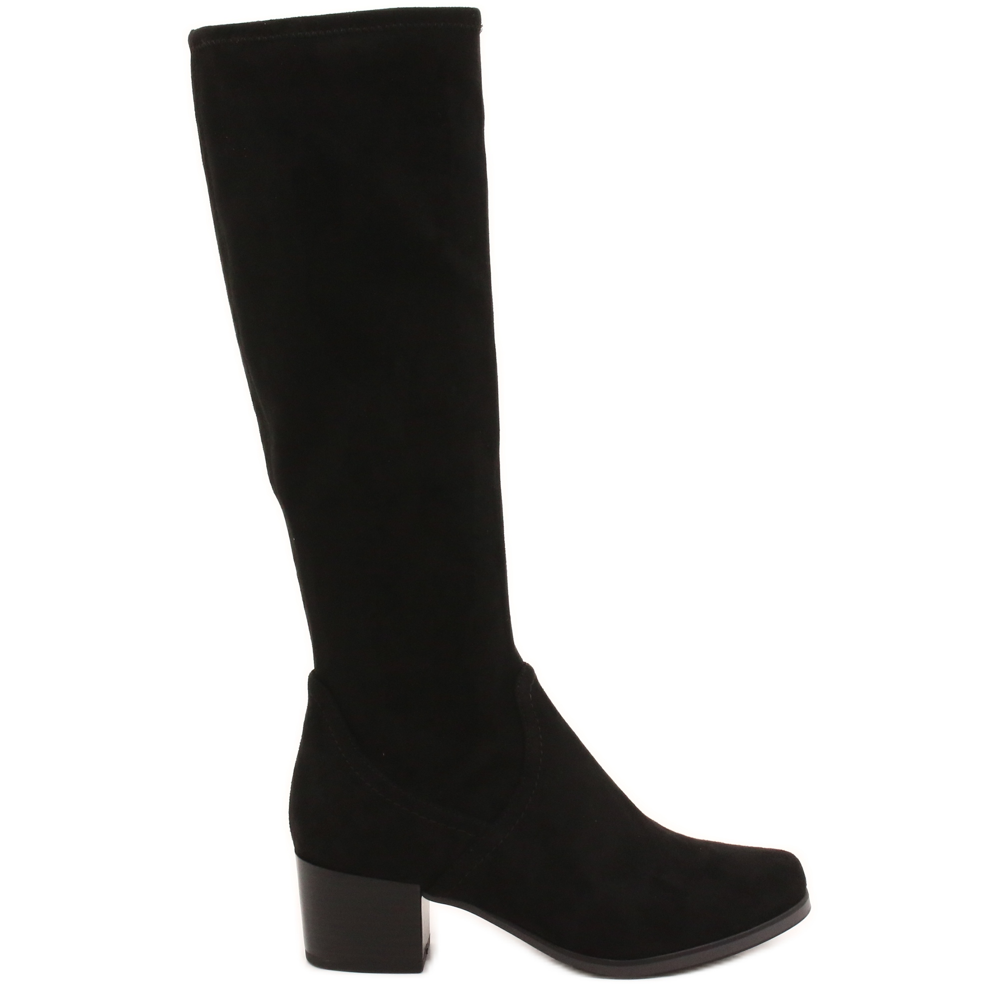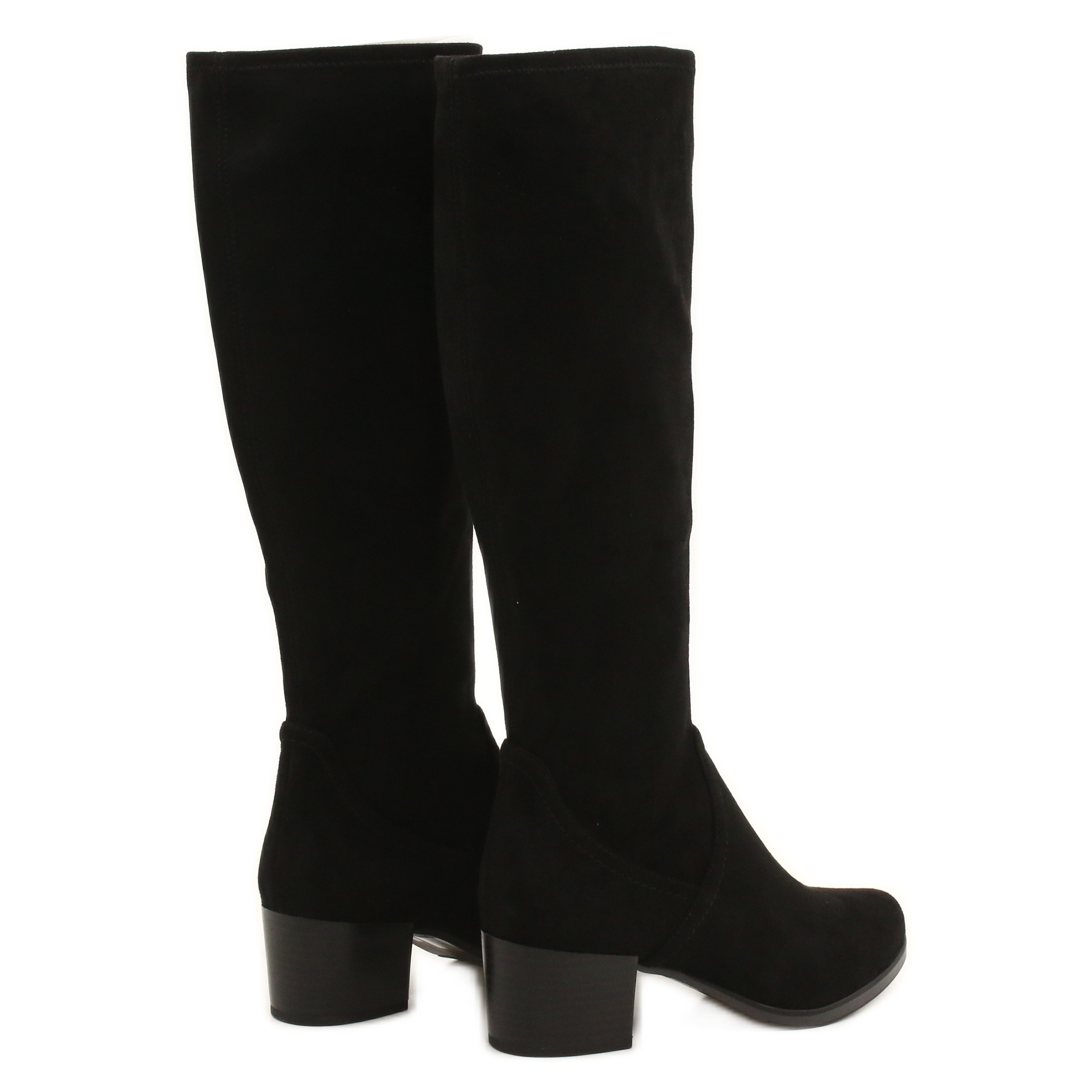 Cizme de caprice lungi, elegante, realizate din material textil dens, întins (întindere) într -o culoare neagră universală. Datorită țesăturii elastice, partea superioară se adaptează frumos la vițel, asigurând un aspect elegant și un confort de purtare. Model vegan 100% PFI - fără componente animale.