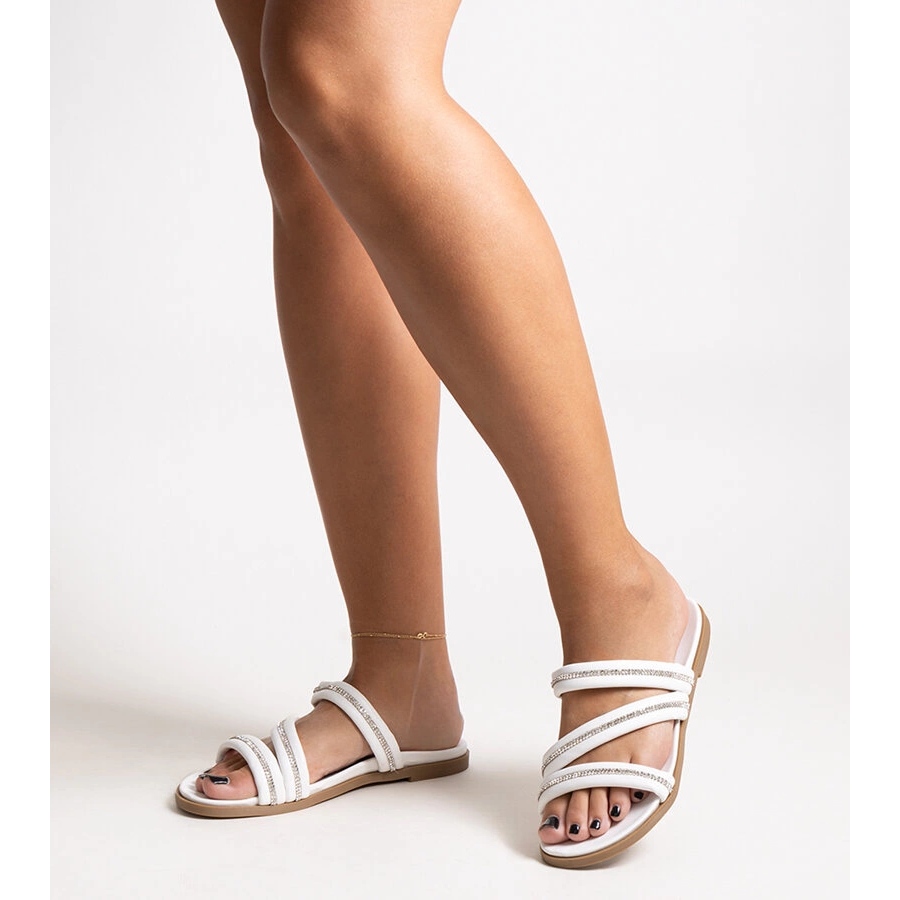Flip -flops alb cu zirconii Martinel sunt o lovitură absolută de vară pe care fiecare femeie ar trebui să o aibă în garderoba ei. Fabricate din piele ecologică de înaltă calitate, acestea garantează nu numai purtând confort, ci și prietenie cu mediul. Un universal lor universal, dar în același timp, un design elegant înseamnă că se potrivesc perfect atât cu plaja, cât și cu seara din oraș.