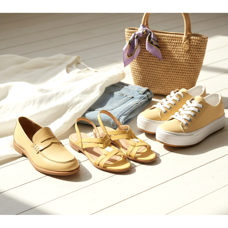 Culoarea numărul unu a sezonului de primăvară/vară 2026 este galbenul de unt - un galben cald, untos, care arată ca scăldat în lumina soarelui. Nu este un galben neon strălucitor, ci o nuanță delicată, cremoasă, care amintește de untul sau crema de vanilie. Funcționează excelent cu încălțămintea - sandalele, mocasinii și adidașii în această culoare adaugă prospețime și optimism stilului.
