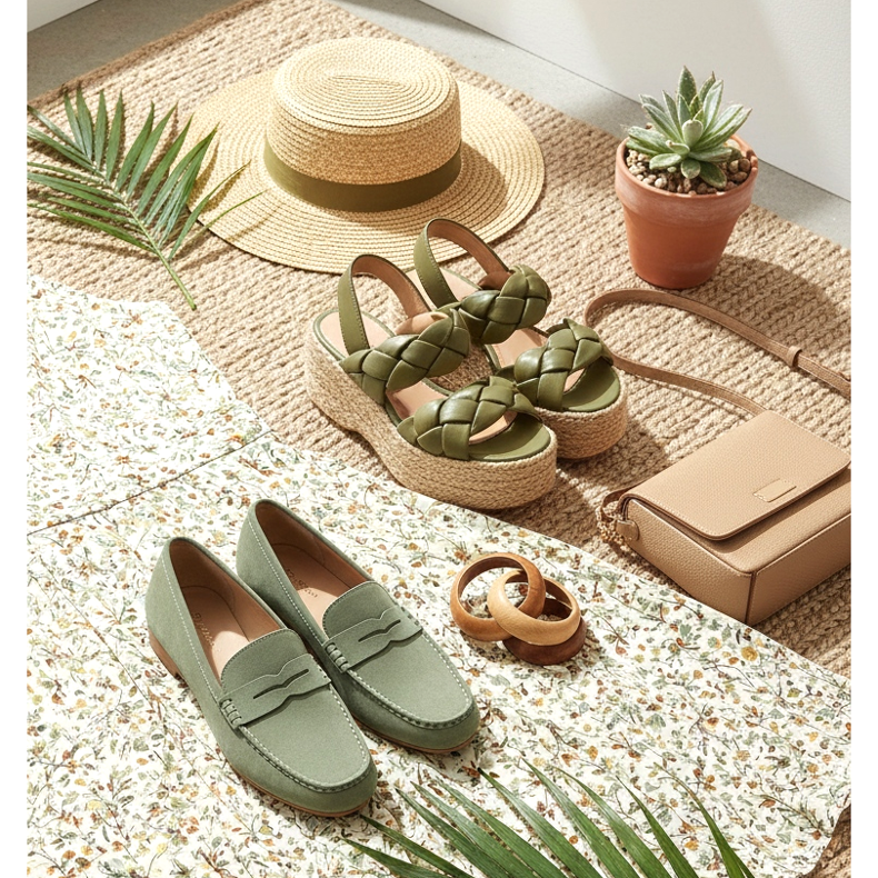Verzii arată extrem de impresionant în încălțăminte. Mocasinii de piele intoarsa de culoarea salvie sunt un hit casual inteligent, iar sandalele cu platforma masline vor completa perfect o rochie florala de vara. Verdele se combină frumos cu maro, bej, crem și alb.