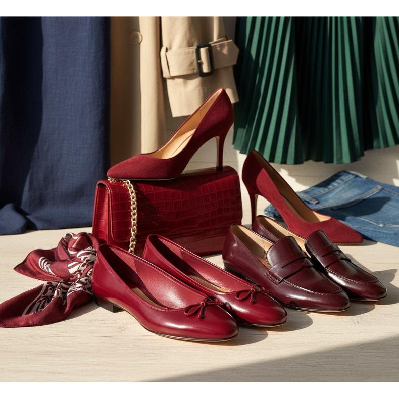 Balerinii sau mocasinii vișinii vor merge bine atât cu un costum lejer, cât și cu o rochie simplă albă. Pompele Burgundy sunt alegerea perfectă pentru ieșirile de seară. Combină aceste culori cu bleumarin, bej, verde închis și denim.