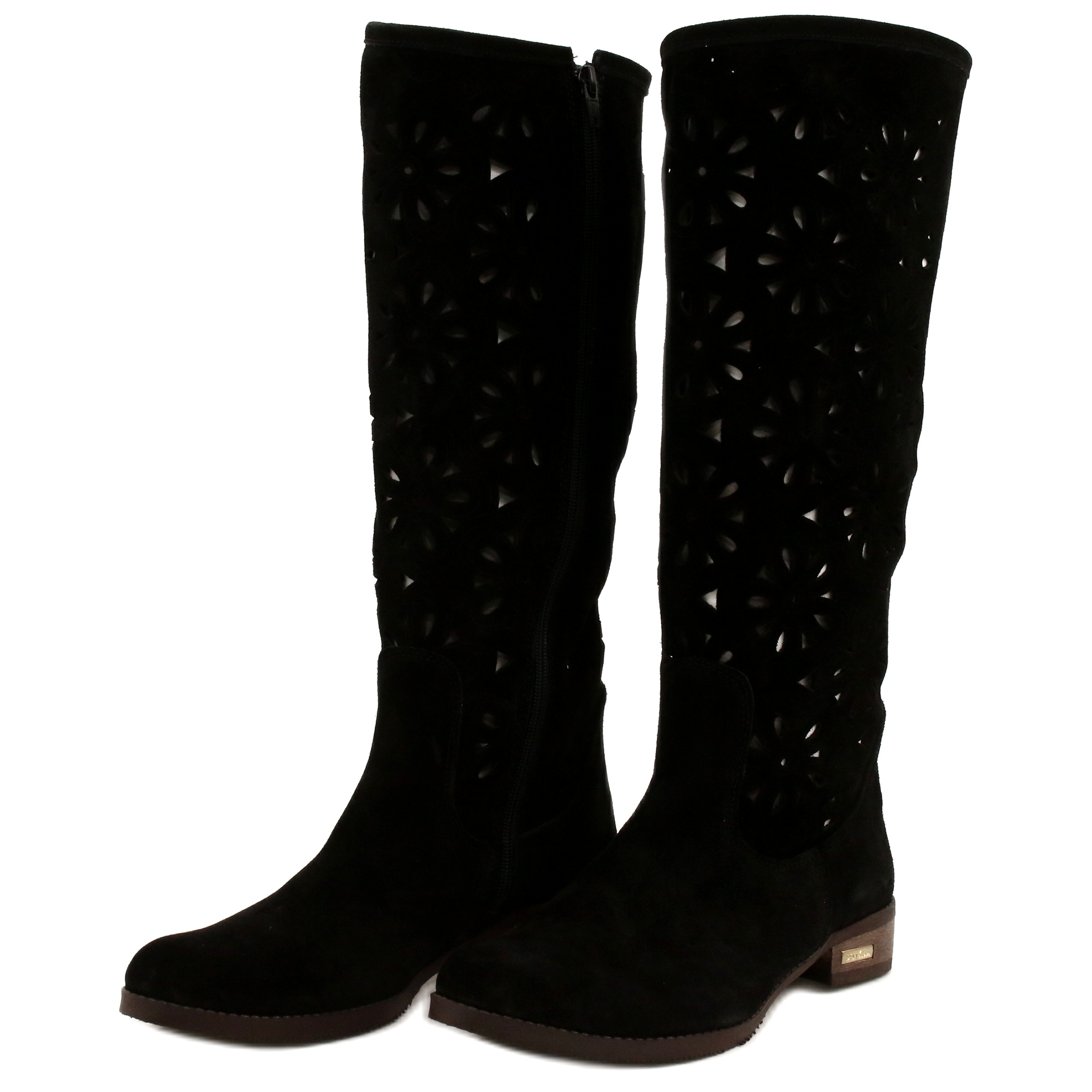 Cizme elegante, ușoare și confortabile pentru femei de la Olivier - perfecte primăvara și toamna. Fabricat din piele naturală (nuubuk / piele de căprioară), plăcut moale și ușor de adaptat la picior. Partea superioară a superiorului este decorată cu un model deschis, geometric și floral, ceea ce oferă pantofilor un personaj feminin și la modă.