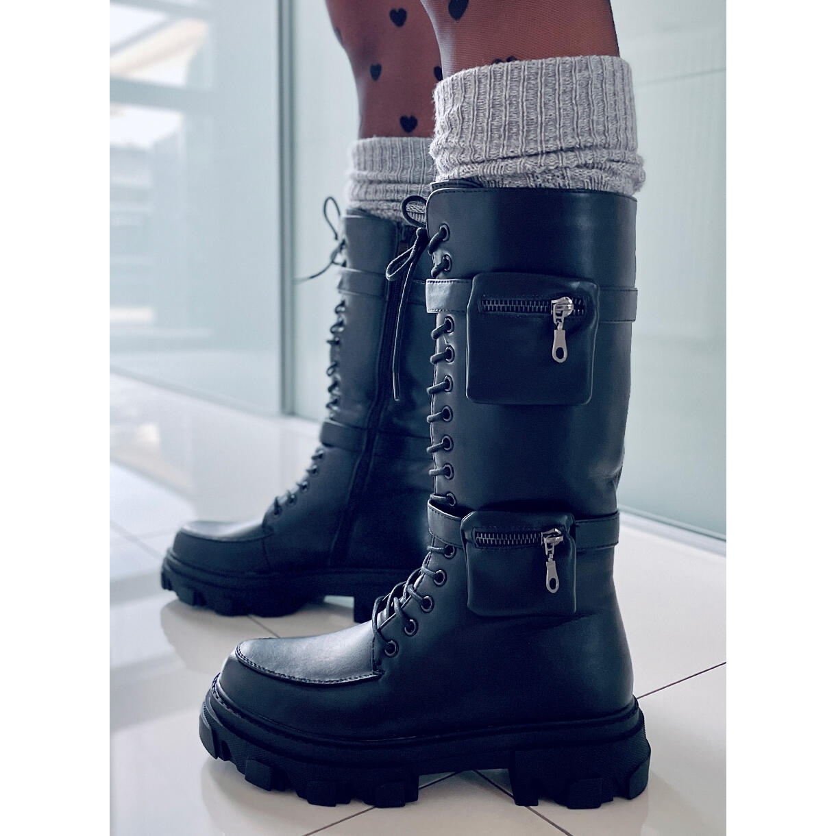 Pentru femeile cărora le plac accentele expresive în stilizările de zi cu zi. Cizmele negre ASOT combină un personaj militar cu soluții practice - o platformă masivă, de 5 cm, adaugă un pas de certitudine, iar pungile de pe partea superioară subliniază designul original, utilitar.