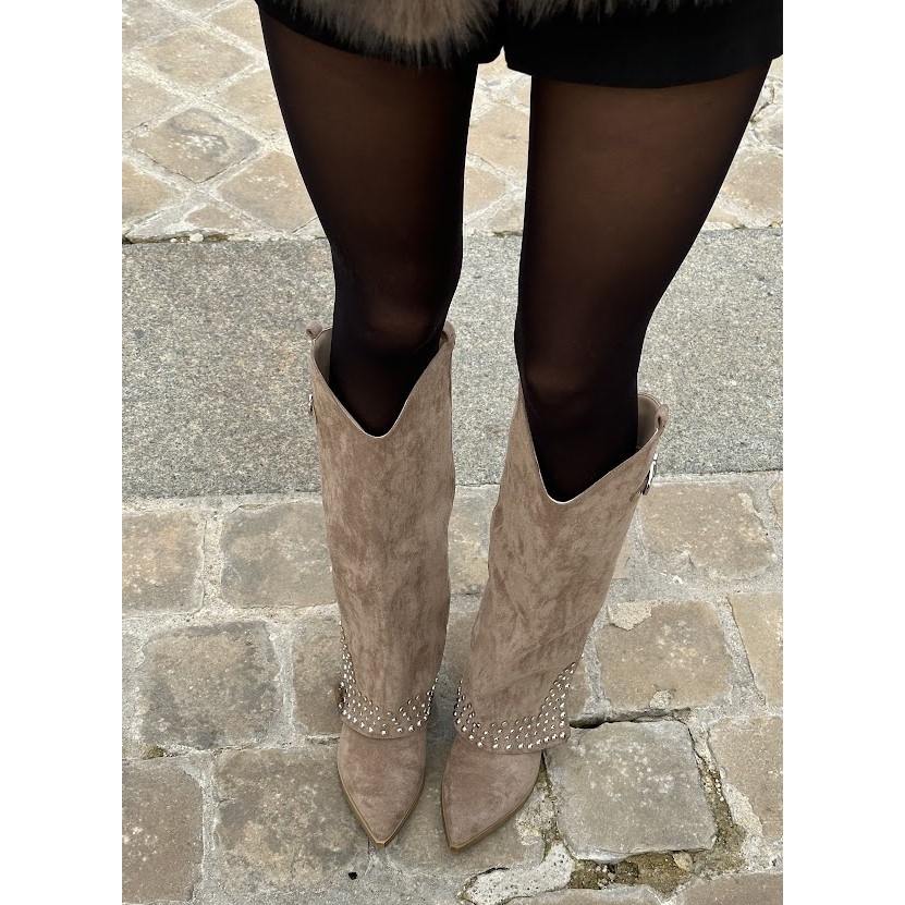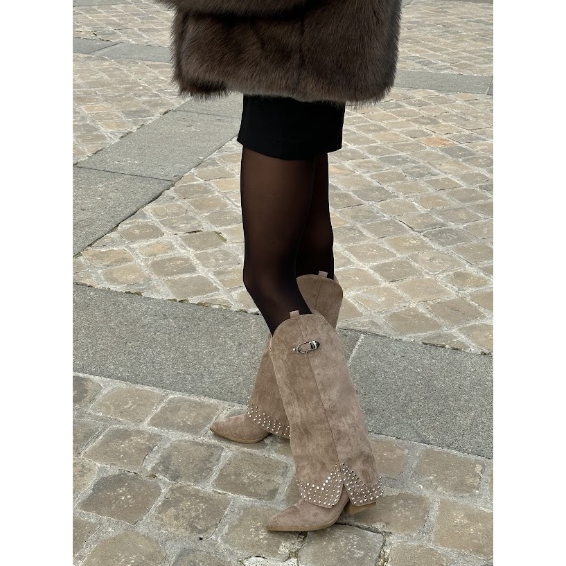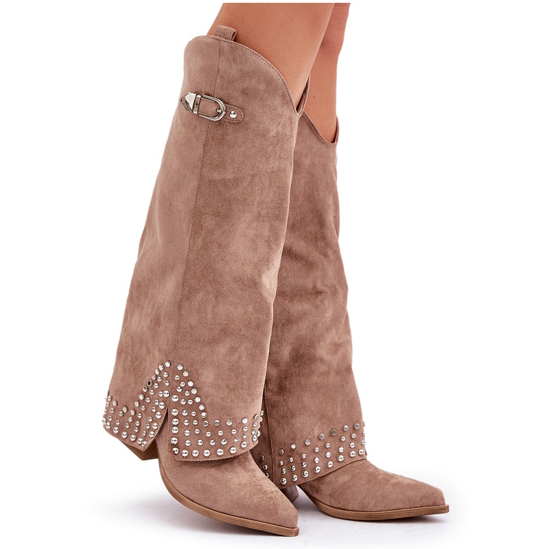 Detalii: Cizme bej închis cu partea superioară răsturnată pe toc înalt