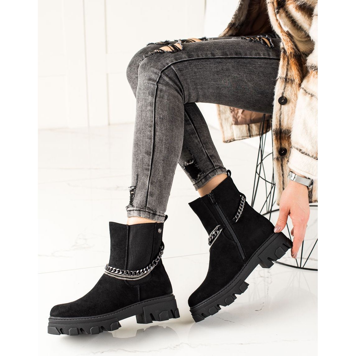 Descoperă eleganța și confortul cu botinele Goodin, care sunt alegerea perfectă pentru zilele mai reci! Aceste botine negre izolate cu lanțuri combină stilul la modă cu funcționalitatea, făcându-le un must-have în orice garderobă.
