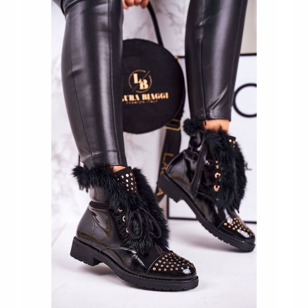 Detalii: SEA Cizme calde pentru femei, cu pietre de stras și blană, glam lacuit negru