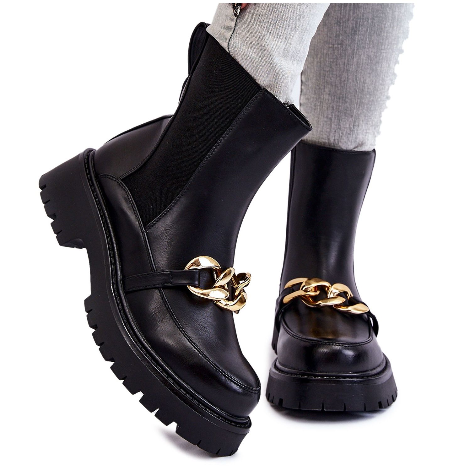 Unul dintre cele mai importante elemente ale acestui model este lanțul impresionant din față, care adaugă un caracter original întregului. Cizmele au toc plat de 5 cm inaltime si talpa canelata, care asigura stabilitate si siguranta in timpul mersului. Culoarea lor neagră minimalistă le face să se potrivească perfect cu diverse stiluri, atât pentru utilizarea de zi cu zi, cât și pentru ocazii mai formale.