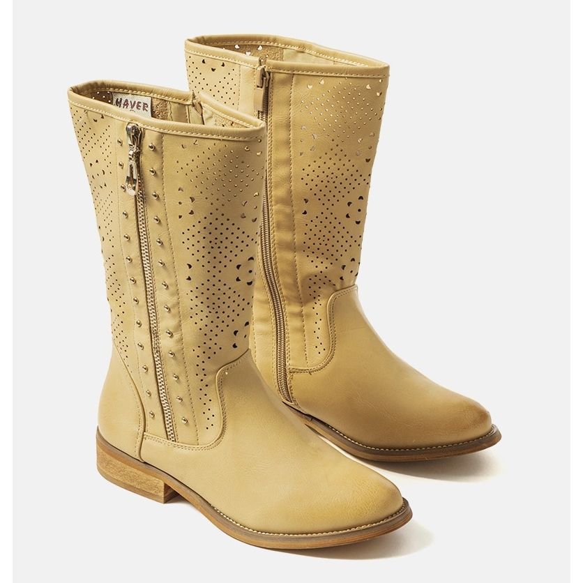 Cizmele delicate, deschise, într -o nuanță bej, sunt o alegere excelentă pentru o fată căreia îi place confortul combinat cu un aspect la modă. Partea superioară din piele ecologică, cu un model decorativ deschis, arată foarte elegant și, în același timp, oferă o ventilație mai bună - de aceea pantofii nu sunt izolați și vor funcționa cel mai bine în sezonul de primăvară.
