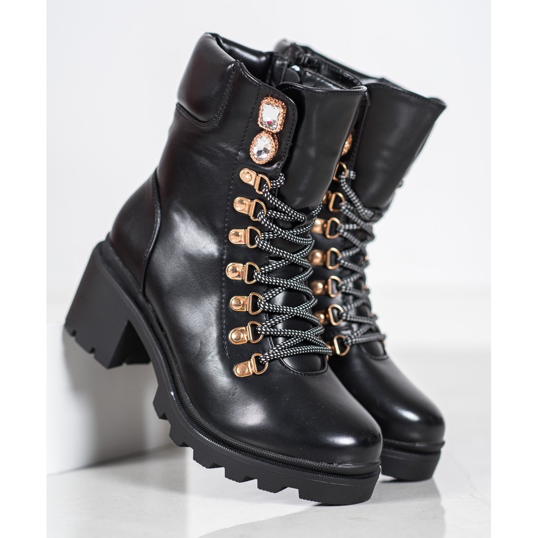 Botinele de damă Seastar sunt alegerea perfectă pentru zilele reci de toamnă și iarnă. Realizate din piele ecologica de inalta calitate, acestea se caracterizeaza printr-un stil extraordinar si atentie la detalii. Încălțămintea neagră, cu șireturi, încântă prin aspectul său la modă, iar șireturile alb-negru și cristalele subtile le adaugă originalitate și eleganță.