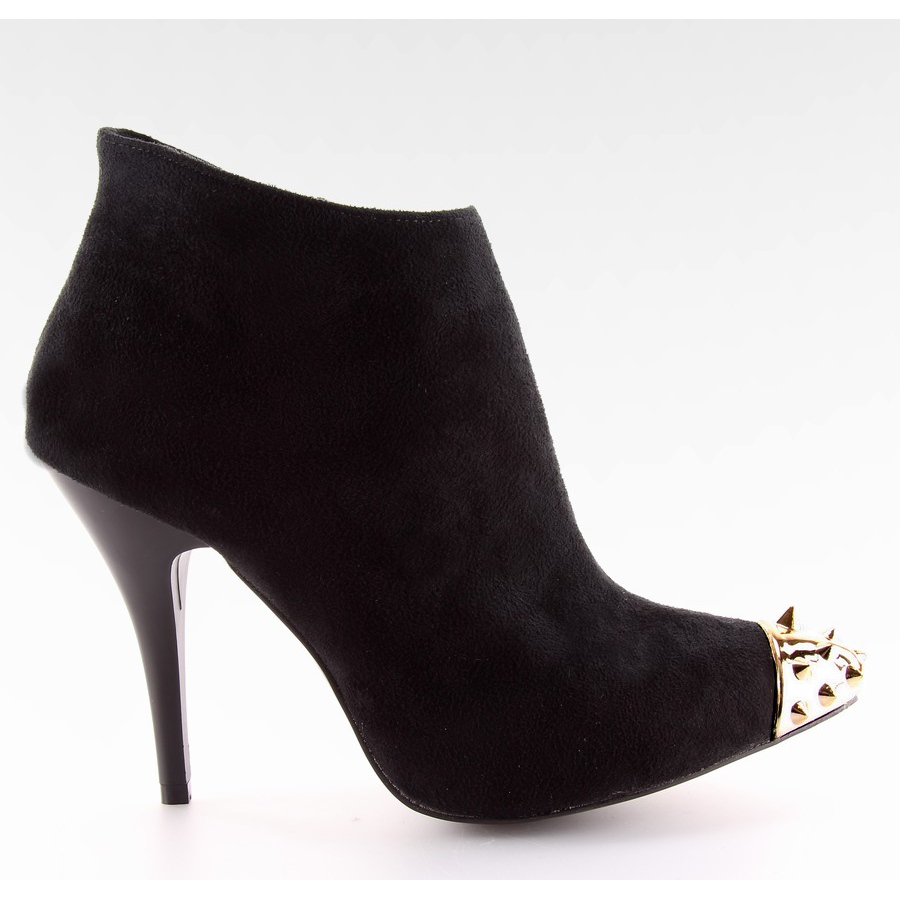 Botine negre elegante cu toc inalt de 10 cm, din piele ecologica piele intoarsa. Degetele de migdale aurii și știfturile subtile le adaugă caracter. Modelul este căptușit cu blană delicată, așa că este potrivit și pentru zilele mai reci. Un fermoar în interior îl face ușor de pus și scos.