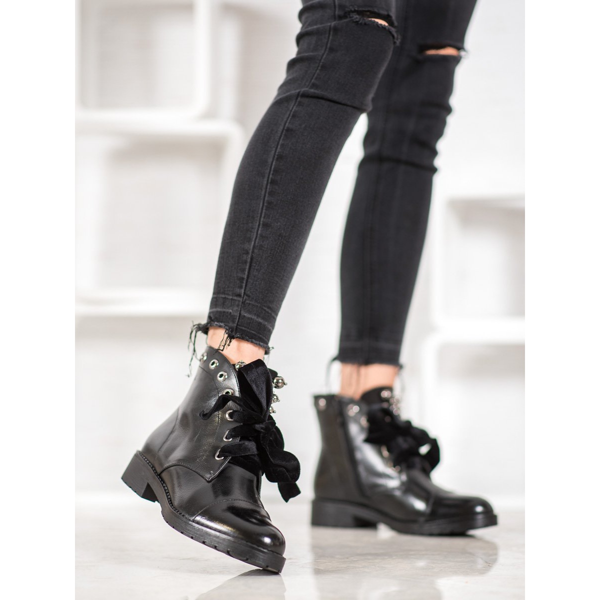 Un vârf rotund atemporal și un toc plat înalt de 3 cm oferă confort pentru purtarea de zi cu zi și un aspect elegant pentru ocazii speciale. Cizmele au un toc moale, care adaugă un plus de suport și stabilitate. Elementele decorative suplimentare, inclusiv o fundita si strasuri argintii, fac acesti pantofi extrem de originali, permitandu-ti sa iesi in evidenta din multime.