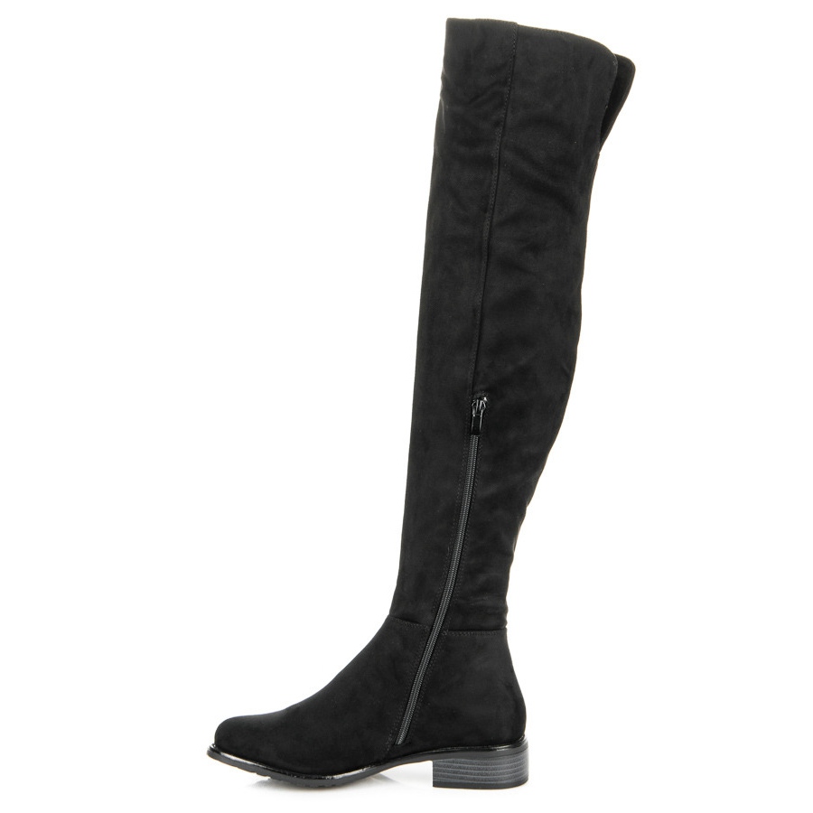 Partea superioară de deasupra genunchiului adaugă eleganță, iar vârful rotund asigură confort pe tot parcursul zilei. Cizmele sunt prevazute cu fermoar, ceea ce le face usor de pus si scos. Tocul plat de 3,5 cm le face nu numai stilate, ci și confortabile, făcându-le o alegere ideală pentru plimbări lungi sau ieșiri de zi cu zi.