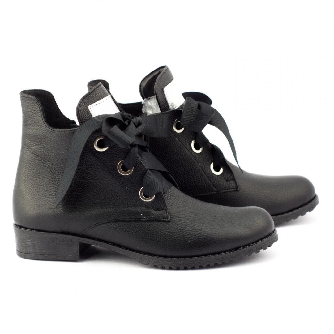 Detaliul original sub forma unei panglici negre adaugă eleganță cizmelor și le face o completare excelentă atât pentru stilurile de zi cu zi, cât și pentru cele mai formale. Cizmele sunt echipate cu o închidere confortabilă cu șireturi și un fermoar, ceea ce ușurează încălțarea și scoaterea pantofilor.