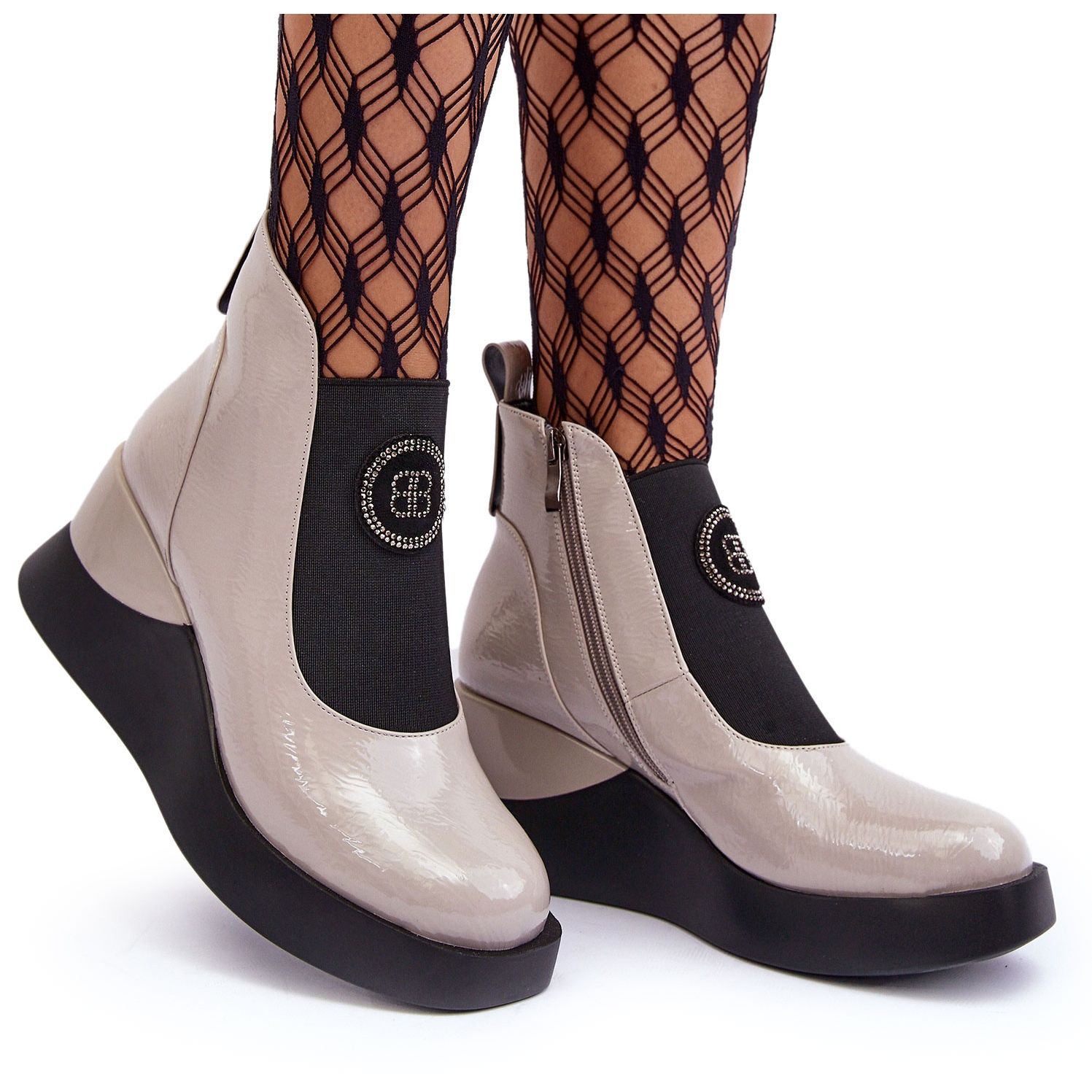 Cizme elegante și confortabile pentru femei S. Barski, perfectă pentru sezonul de toamnă. Modelul setat pe o pană stabilă cu o înălțime de 7 cm cu o platformă subtilă, datorită căreia adaugă centimetri, fără a renunța la confortul mersului. Fabricat din piele ecologică lăcuită într -o nuanță de L. gri cu accente negre - un aspect modern, universal, care se potrivește cu multe stiluri.