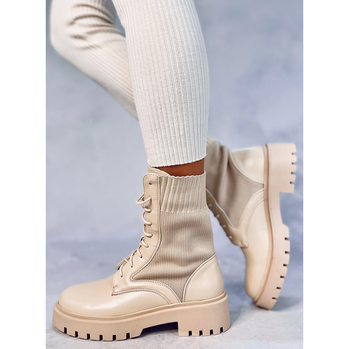 Acestea sunt botine de damă bej, populare în special printre femeile care preferă stilul vestimentar de zi cu zi și militar. Pantofii sunt alegerea perfectă pentru zilele de toamnă. S-a avut grijă ca acestea să fie nu doar elegante, ci și practice - datorită șiretului, pot fi ajustate perfect la orice lățime a piciorului, iar partea superioară a șosetei flexibile ușurează încălțarea pantofilor și se potrivește bine piciorului. . Cizmele sunt netede și fără modele suplimentare.