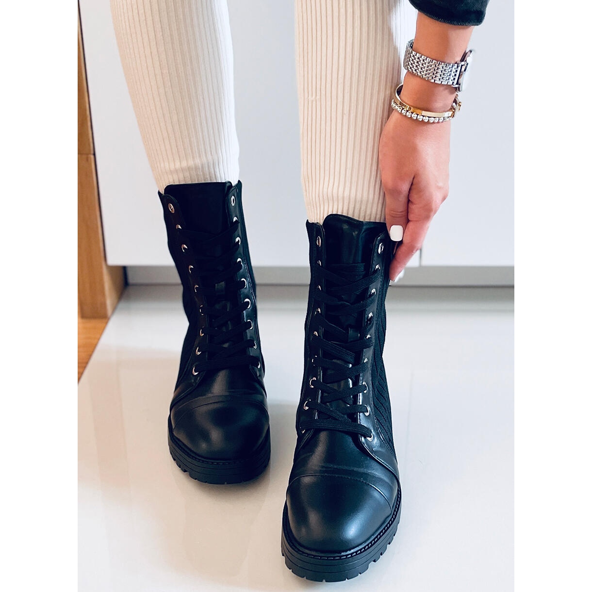 Partea superioară flexibilă a cizmelor se potrivește perfect piciorului, ceea ce nu numai că le îmbunătățește estetica, ci și ușurează mult încărcarea lor. Datorită șiretului, aceste cizme pot fi ajustate la orice lățime a piciorului, ceea ce asigură confort în orice situație. Fabricate din piele și țesătură ecologică de înaltă calitate, nu sunt doar durabile, ci și ecologice.