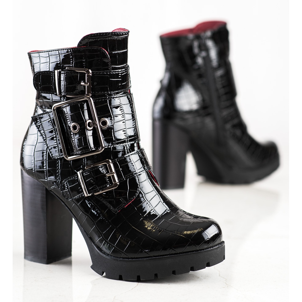 Botinele cu toc înalt Erynn Fashion în negru sunt alegerea perfectă pentru fiecare femeie elegantă care vrea să îmbine stilul și confortul. Confectionate din piele ecologica de inalta calitate, aceste botine lacuite impresioneaza prin designul lor minimalist, dar la moda.