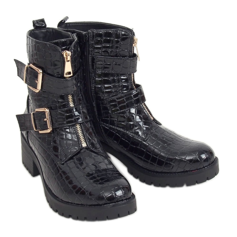 Va prezentam cizme de dama negre lavete SP74-1 Black, care imbina eleganta cu confortul, potrivindu-se perfect cu ultimele tendinte. Aceste cizme unice, cu toc lat, de 5 cm înalt, atrag atenția prin motivul crocodil la modă și accesoriile aurii fenomenale care le conferă un caracter extraordinar.