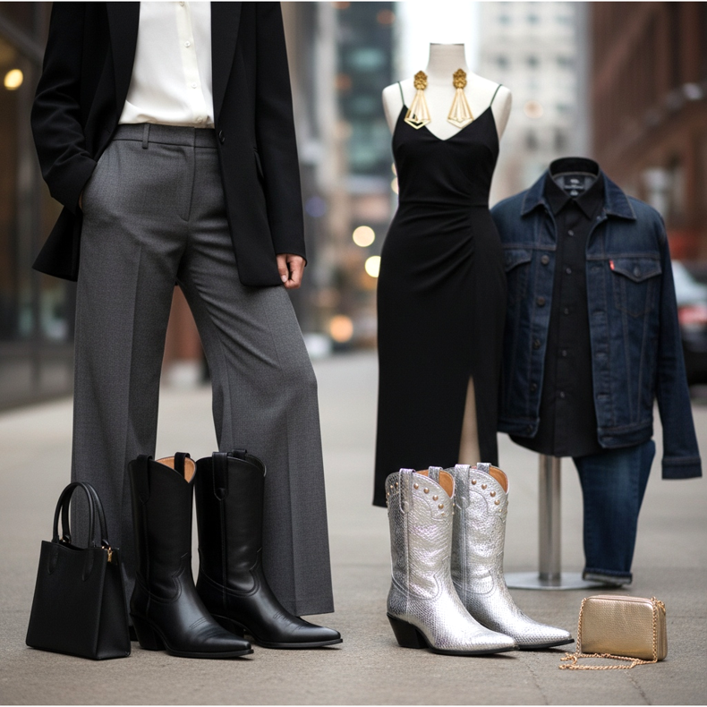 Pentru iesirile de seara alege cizme de cowboy din material lucios sau cu detalii metalice. Cizmele western aurii sau argintii combinate cu o rochie midi neagră creează un efect dramatic, dar șic. Nu uita de accesoriile potrivite - cerceii mari si o geanta minimalista pe lant vor completa acest stil.