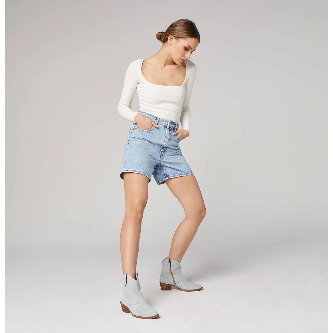 - Se amestecă bine cu denim (pantaloni scurți, tuburi, blugi de mamă) și alb.