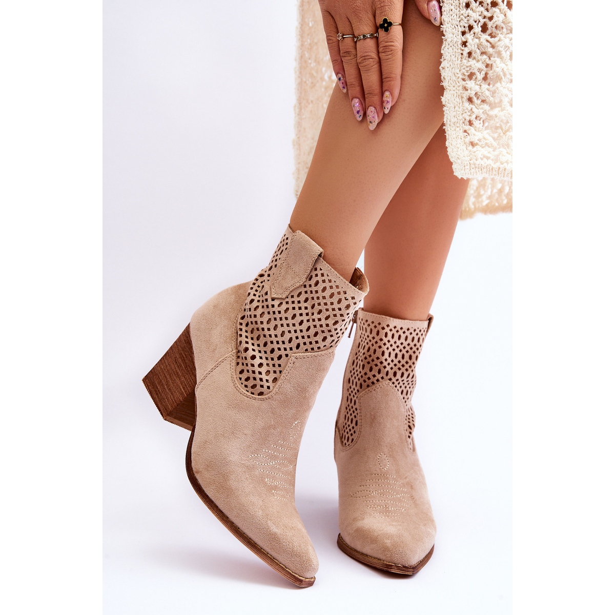 Descopera extraordinarele cizme cowboy de dama din piele intoarsa FB1, care imbina perfect stilul clasic cu un finisaj modern. Aceste botine bej cu toc înalt sunt alegerea perfectă pentru fiecare femeie care vrea să iasă în evidență în mulțime. Partea superioară a gleznei este realizată din piele intoarsa ecologica, decorata cu model ajurat si cusaturi subtile in fata, ceea ce le confera un caracter unic.