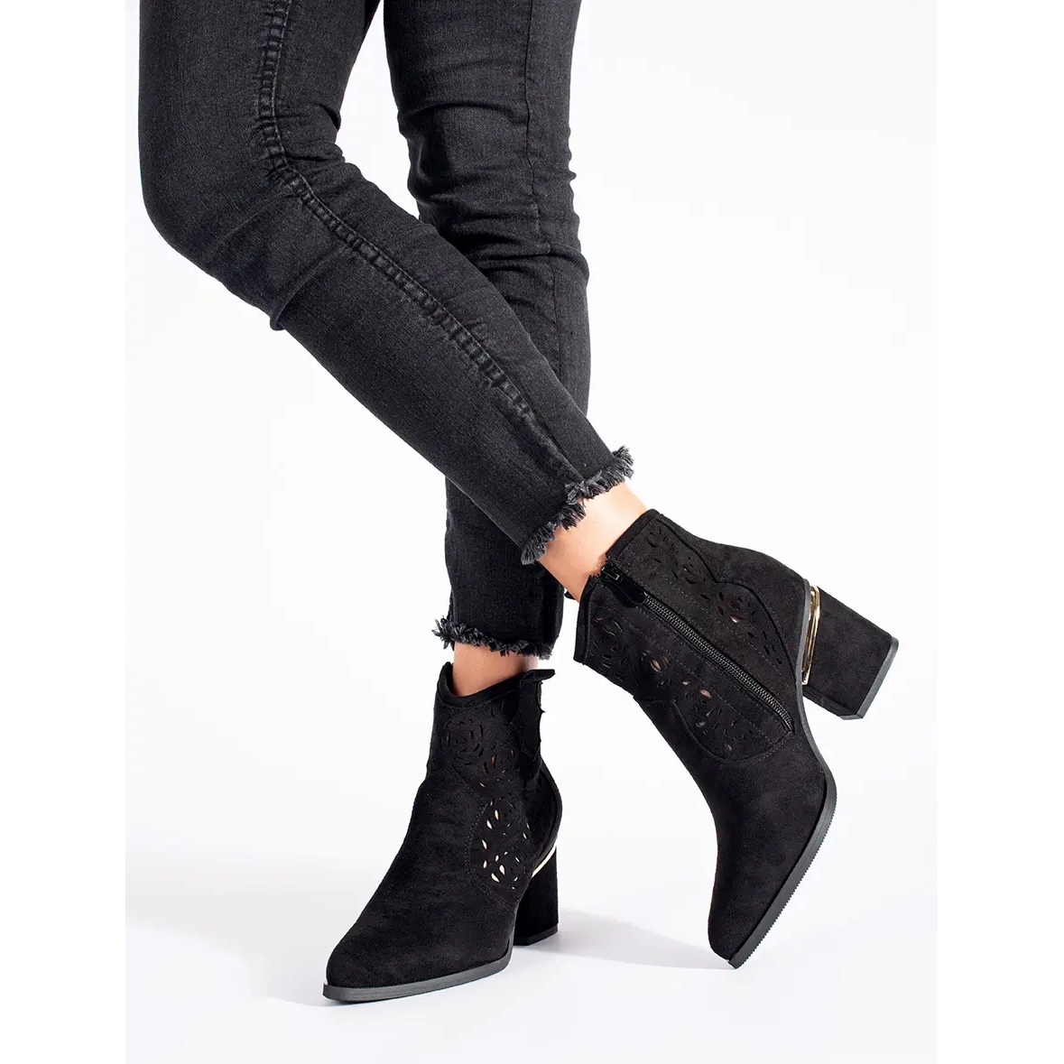 Fabricate din piele ecologică din piele de căprioară, cizmele de cowboy arată nu numai elegante, ci și au grijă de mediu. Culoarea lor neagră îi face să se potrivească cu multe stiluri, atât zilnic, cât și ocazii mai elegante. Modelul deschis le oferă un personaj feminin, iar nasul de migdale vă permite să purtați confortabil toată ziua.