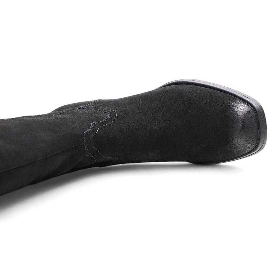 Înălțimea superiorului a aproximativ 37 cm înseamnă că cizmele ajung până la genunchi, iar un călcâi plat cu o înălțime de 4 cm oferă confort în timpul activităților zilnice. Nasul rotund le oferă un personaj clasic, iar culoarea neagră universală le face să se îmbine perfect cu diverse stilizări - atât în versiuni casual, cât și mai elegante.