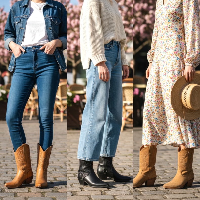 Cizmele de cowboy sunt surprinzător de versatile și pot fi combinate cu multe articole de garderobă diferite. Cheia succesului este echilibrul – dacă pantofii sunt izbitori, restul ținutei ar trebui să fie mai subțire.