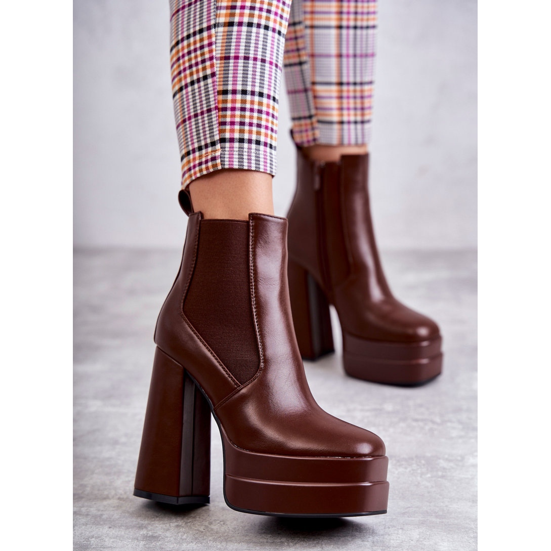 Cizme elegante din piele ecologică într -o nuanță la modă, caldă de maro. Situate pe un călcâi larg, stabil, cu o platformă (călcâie de 13 cm), acestea combină un aspect distinct și un confort de purtare. Un nas pătrat, un călcâi rigidizat și o încuietoare practică facilitează punerea. Inserarea flexibilă pe părțile laterale se adaptează la picior, iar inserția eco-piele oferă o senzație plăcută atunci când mergeți.