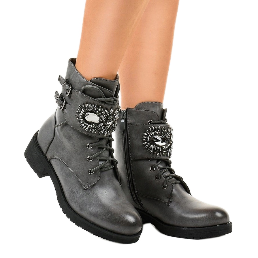 Culoarea gri elegantă face ca ghetele să se potrivească perfect cu diverse stiluri, adăugându-le un caracter unic. Un avantaj suplimentar sunt strasurile care decorează eficient pantofii, oferindu-le un aspect la modă. Talpile sintetice solide si un toc plat de 4 cm inaltime fac cizmele stabile si confortabile, ceea ce le permite sa fie purtate ore lungi.