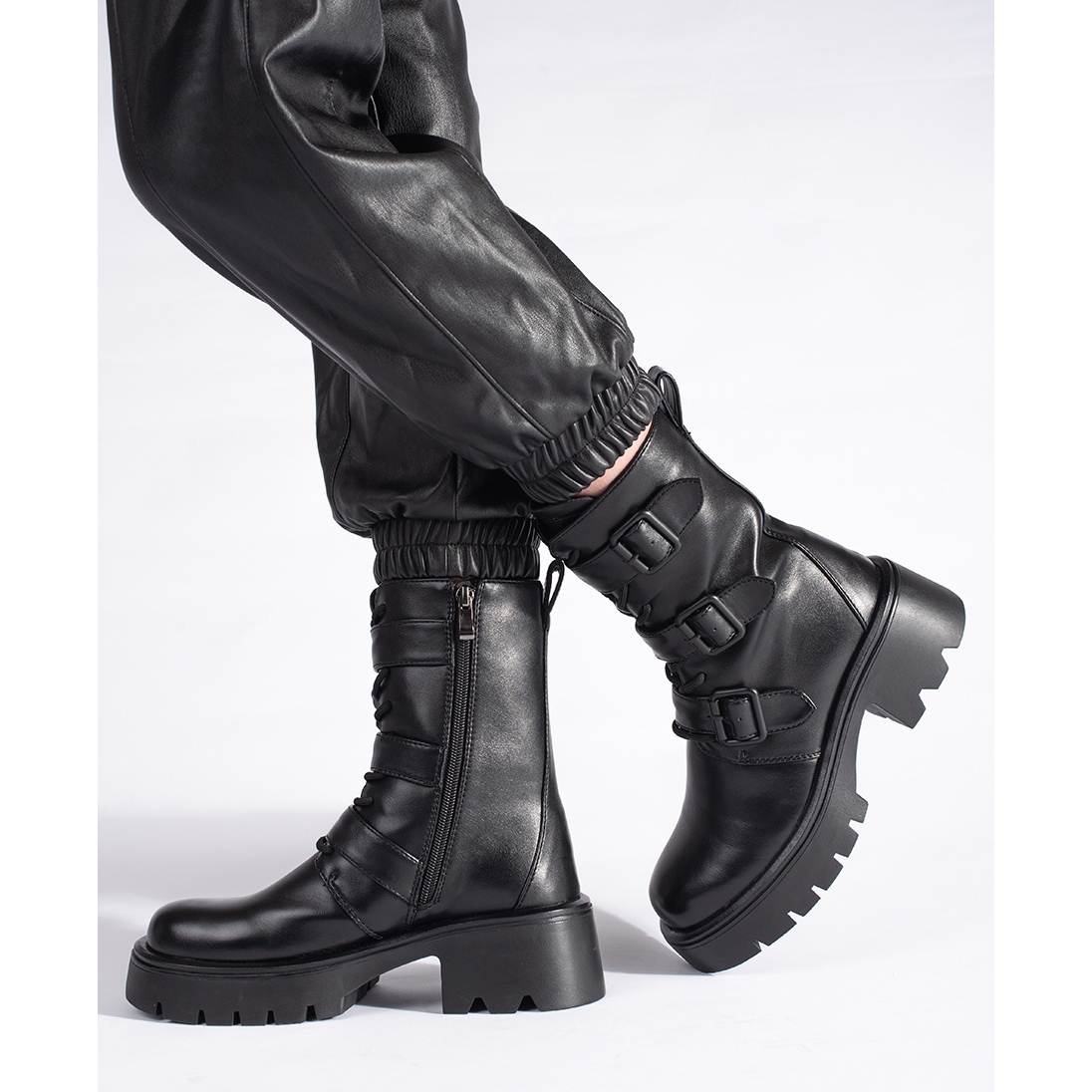 Detalii: Cizme de damă înalte, negre, de muncitor, cu catarame negru