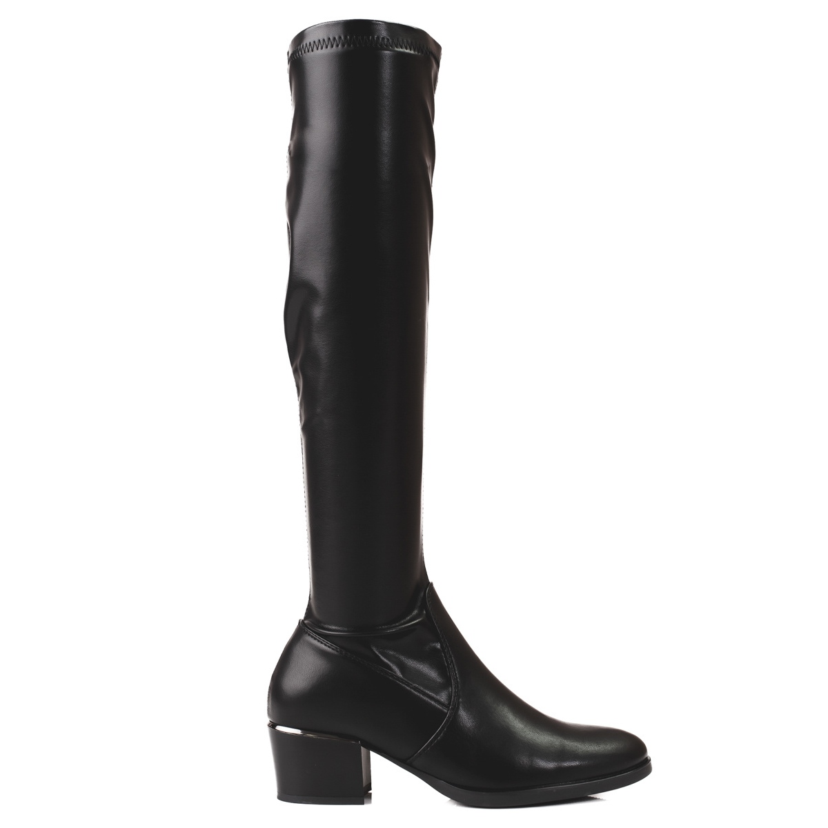 Cizmele Vinceza de damă cu toc mic patentat în negru sunt o alegere perfectă pentru fiecare femeie care vrea să îmbine eleganța cu confortul. Croiala clasica deasupra genunchiului, cu toc incorporat, rigidizat si varf rotund, le confera un caracter unic, iar tocurile joase de 5 cm inalte asigura stabilitate si confort la purtare, perfecte pentru utilizarea de zi cu zi.