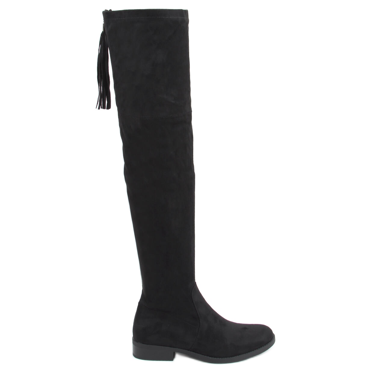 Va prezentam cizme peste genunchi din piele intoarsa Nana de dama intr-o culoare neagra eleganta, care cu siguranta vor atrage atentia prin stilul lor la moda. Aceste cizme lungi se remarcă printr-un vârf rotunjit și un detaliu atrăgător sub formă de franjuri, care le conferă un farmec unic. Talpa plată asigură confort maxim atunci când sunt purtate, făcându-le alegerea perfectă pentru utilizarea de zi cu zi.