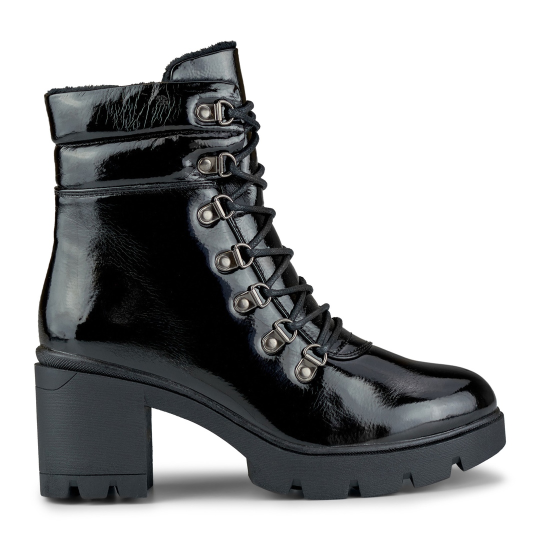 Suprafața lăcuită adaugă stilul și caracterul modern, iar agățarea practică a fermoarului și dantelarea garantează o potrivire perfectă a piciorului. Postul de 7 cm înalt asigură stabilitatea și confortul pe parcursul zilei, iar izolarea de la Eco-Futra va menține căldura în zile mai reci. Talpa sintetică este ușoară și durabilă, ideală pentru utilizarea de zi cu zi.