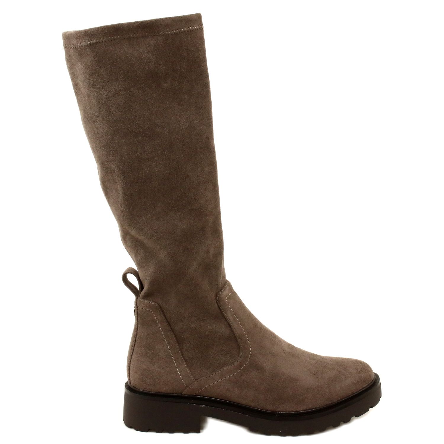 Cizme elegante de cafenea din cafenea, confecționate dintr -un material cărnos din piele de căprioară, care se adaptează flexibil la vițel. Tăierea clasică cu nasul rotunjit și un toc stabil, de 4 cm face ca figura să pară mai subțire, iar mersul rămâne confortabil toată ziua.