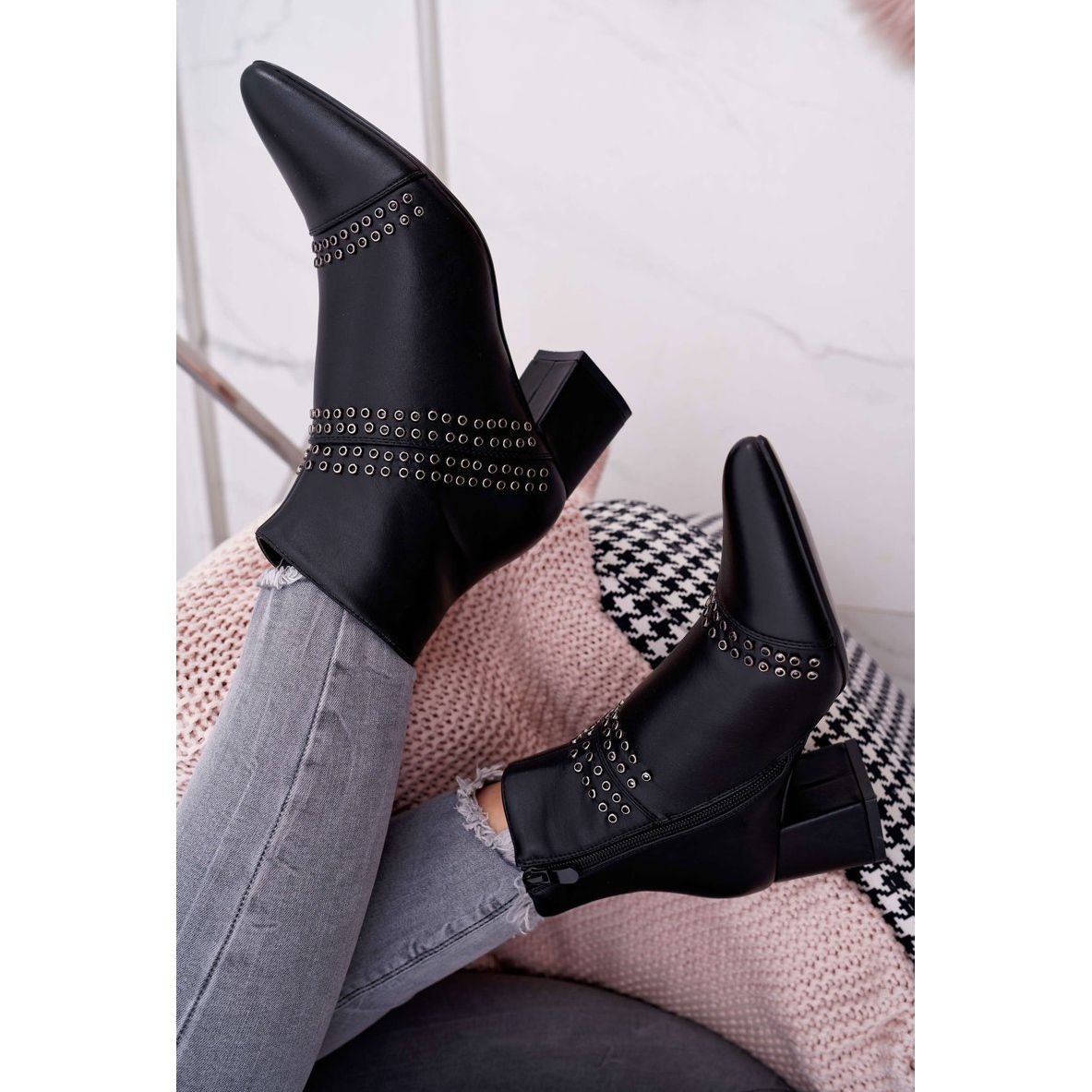 Decorațiile sub formă de nituri conferă cizmelor un caracter mai puternic, atrăgând atenția și adăugând un stil unic. Înălțimea tocului de 5,5 cm în bloc le face nu doar elegante, ci și confortabile de purtat toată ziua. Cizmele ajung deasupra gleznei, ceea ce le subliniază și mai mult croiul feminin.