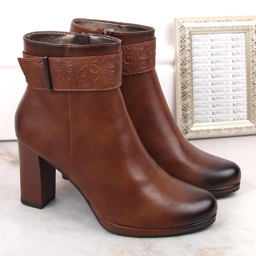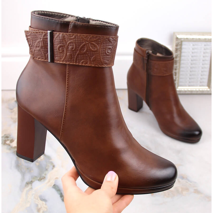 Botinele de damă cu toc înalt și platformă semnate de marca M. Daszyński sunt încălțăminte maro din piele ecologică. Interiorul pantofilor este finisat cu blana, ceea ce asigura confort si caldura in zilele reci. Modelul AF125-19 are caracteristici casual distincte. Botinele pot fi purtate ca pantofi de toamnă, iarnă sau formali.