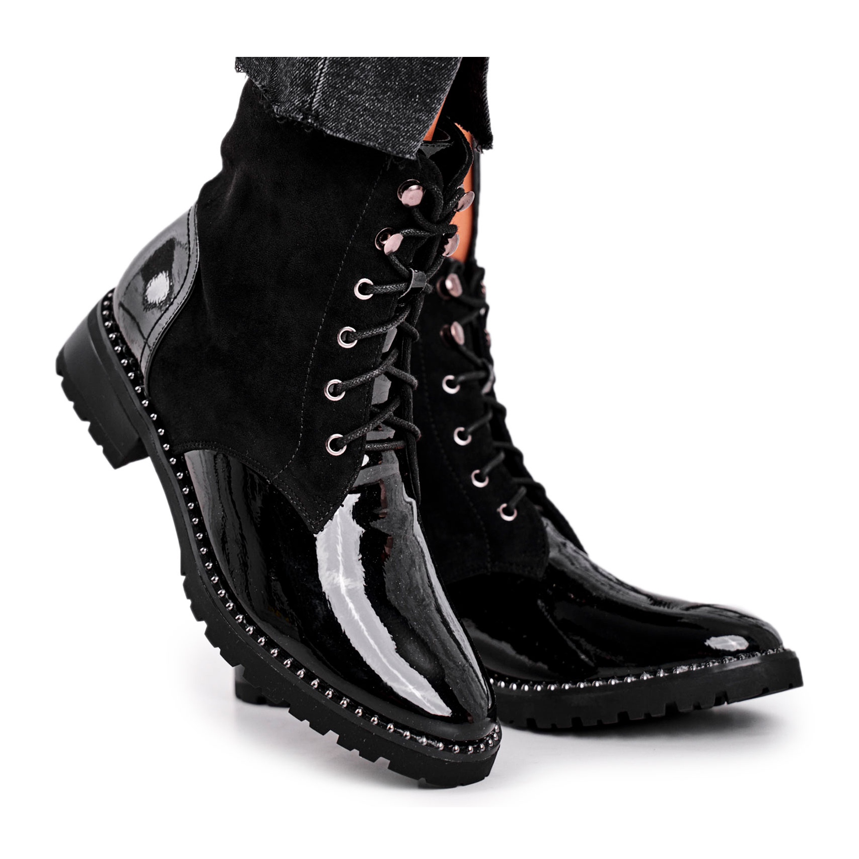 Stilul ghetelor este clasic cu șireturi, iar un fermoar suplimentar pe partea superioară îl face ușor de pus și scos. Înălțimea superioară de 14,5 cm și un toc plat de 4 cm asigură nu numai confort, ci și stabilitate în timpul mersului. Cizmele sunt decorate cu strasuri si crampoane, ceea ce adauga caracter si stil unic.