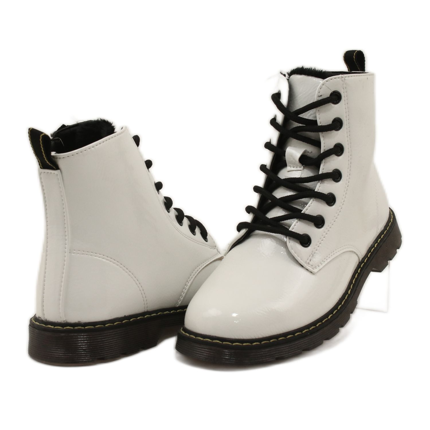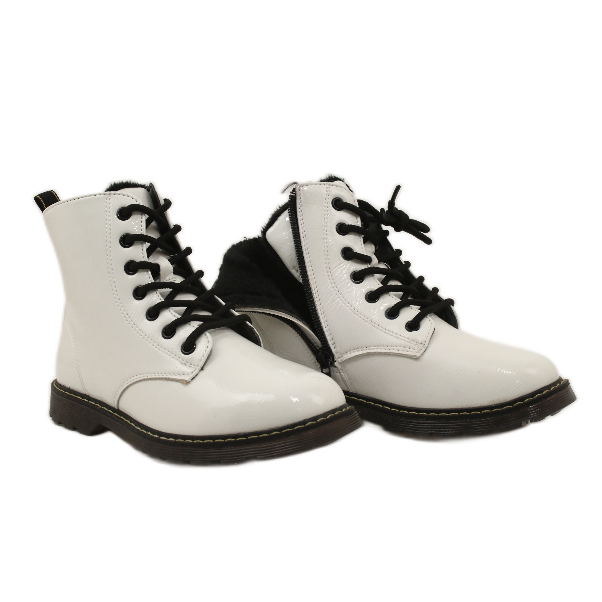 Cizme elegante, fete, fete, din piele ecologică albă de înaltă calitate, cu finisare lăcuită. Modelul este izolat cu o blană moale de încălțăminte Evento - insertul și interiorul pantofului asigură căldura și confortul în zilele mai reci.