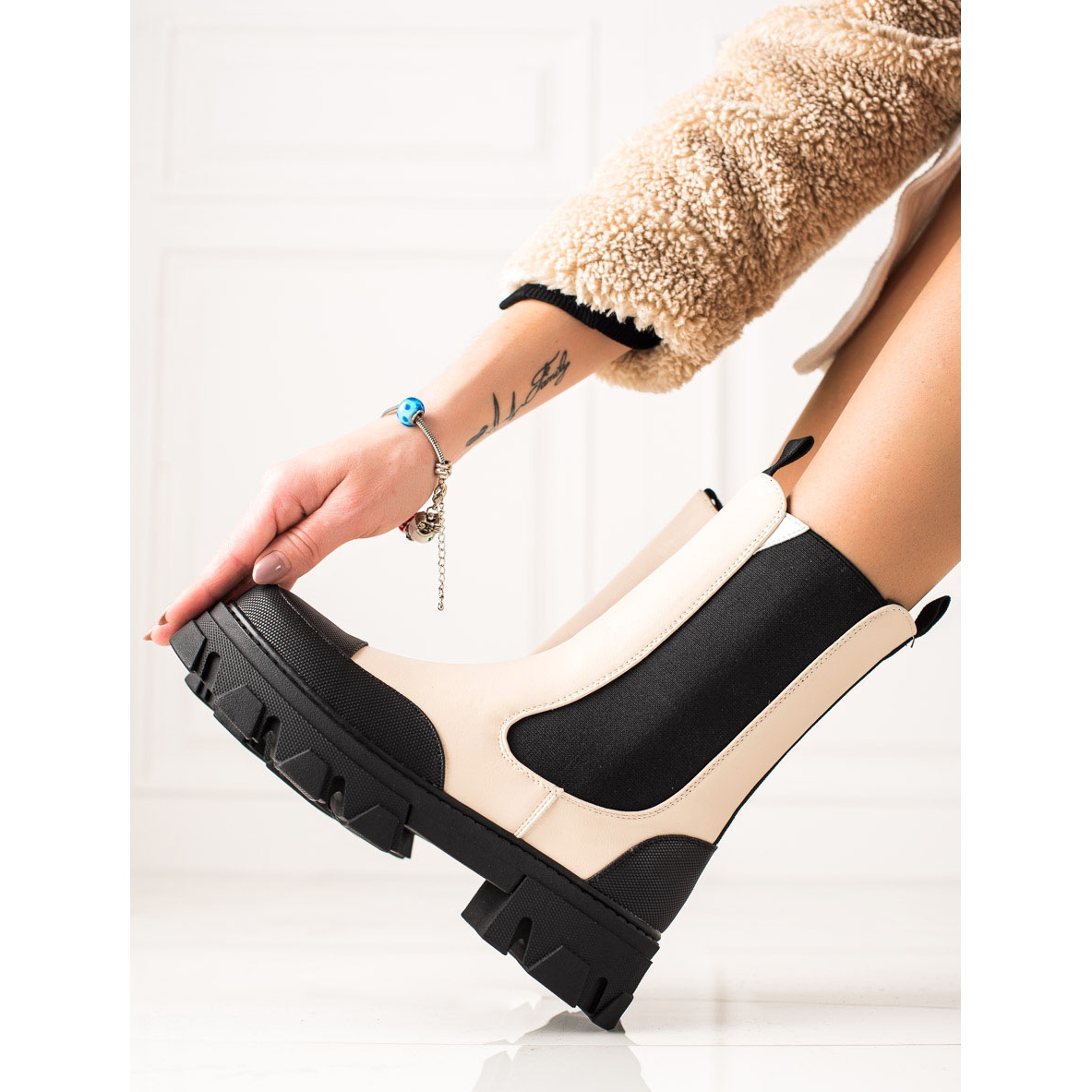 Un avantaj suplimentar este tocul plat mereu la modă de 5 cm înălțime și platforma înaltă de 3,5 cm, care adaugă stil fără a sacrifica confortul. Izolația internă face cizmele perfecte pentru zilele mai reci, iar materialul textil al branțului asigură confortul la purtare.