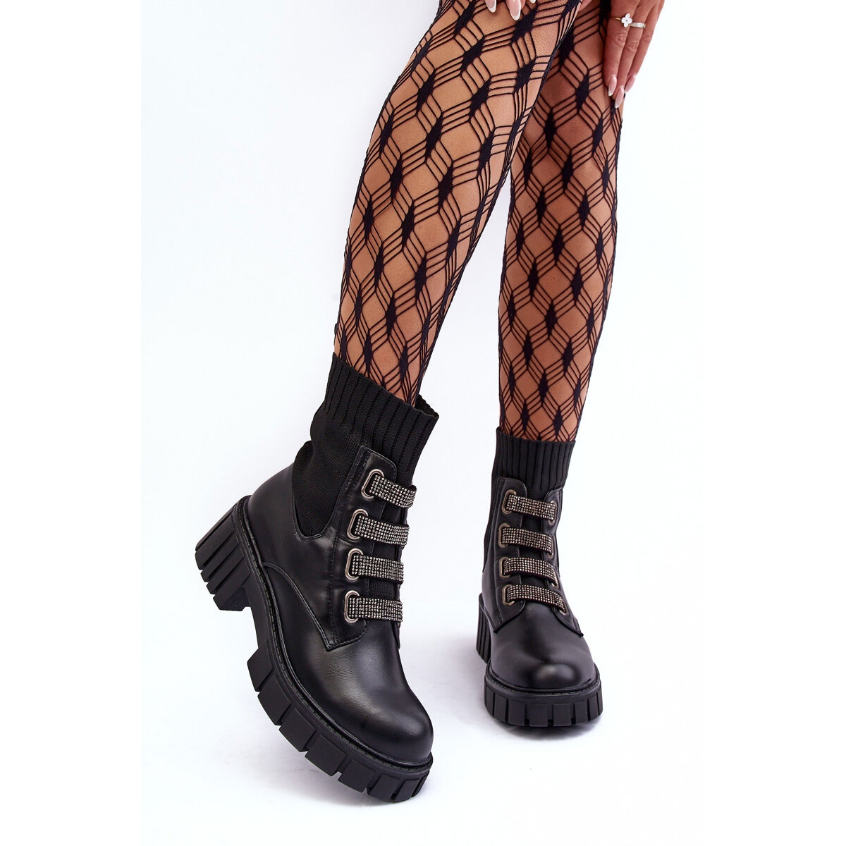 Ghetele de muncitori cu partea superioara elastica neagra Kasseis sunt incaltaminte de dama de inalt confort si design elegant. Sunt confectionate din piele ecologica si material de inalta calitate, cu toc plat si platforma inalta de 3,5 cm. Elementele caracteristice sunt micile strasuri care decorează bretelele din față și o parte superioară în formă de șosetă flexibilă, ușurând îmbrăcarea. Cizmele sunt izolate cu o pătură de pantofi la înălțimea piciorului, care asigură confort atunci când sunt purtate în zilele mai reci.