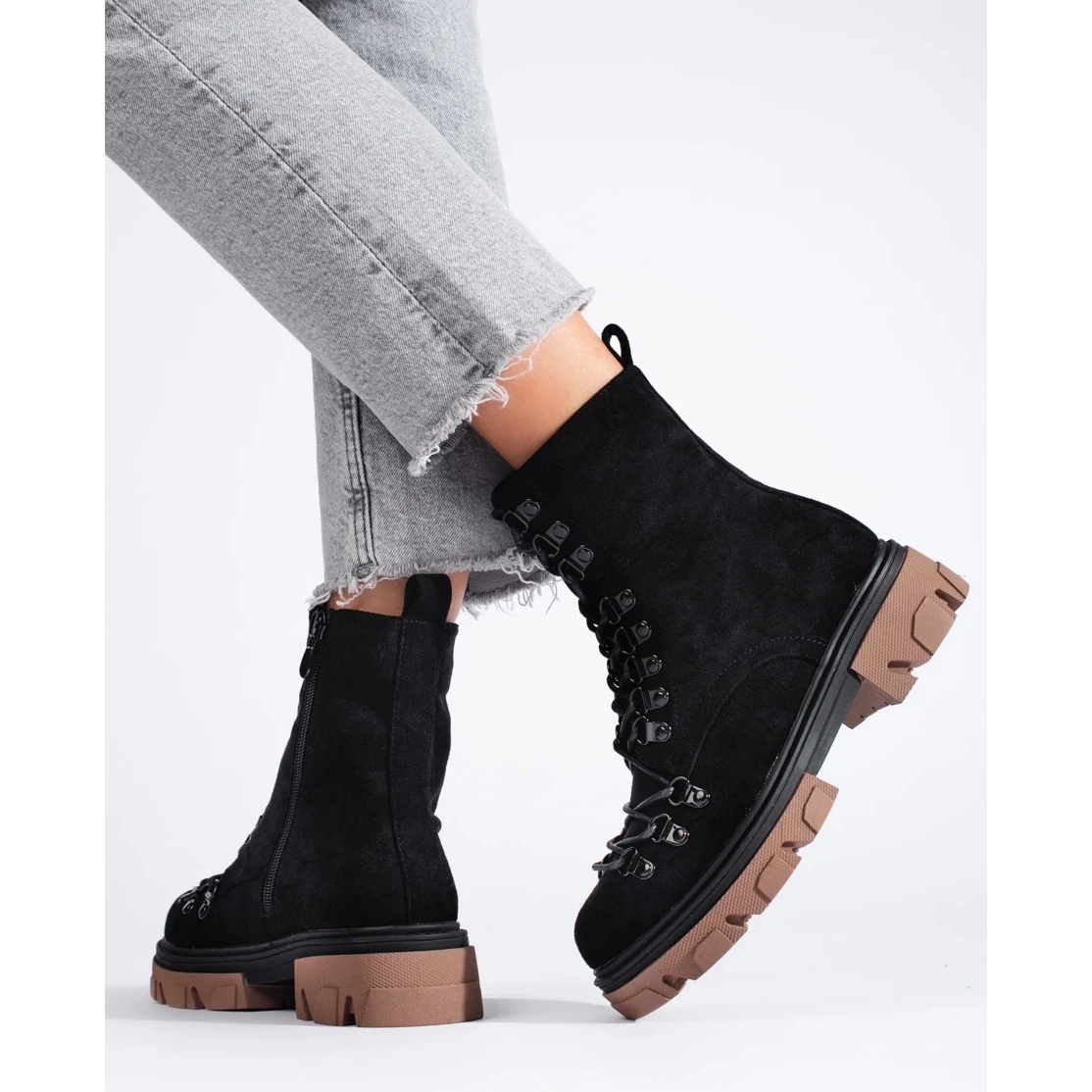 Muncitorii femeilor din Vinceza elegante și confortabile într -un finisaj negru, din piele de căprioară. Ideal pentru stilizări de zi cu zi, casual pentru toamnă, iarnă și primăvară - combină un aspect la modă cu încălzirea practică și sigur de picior.