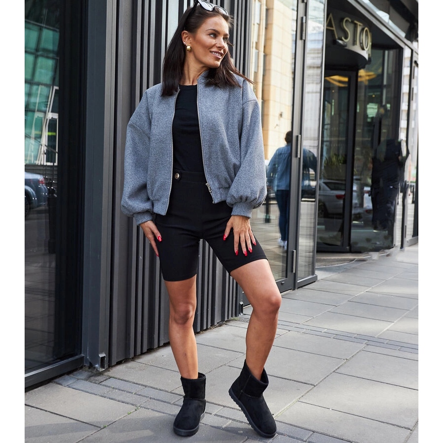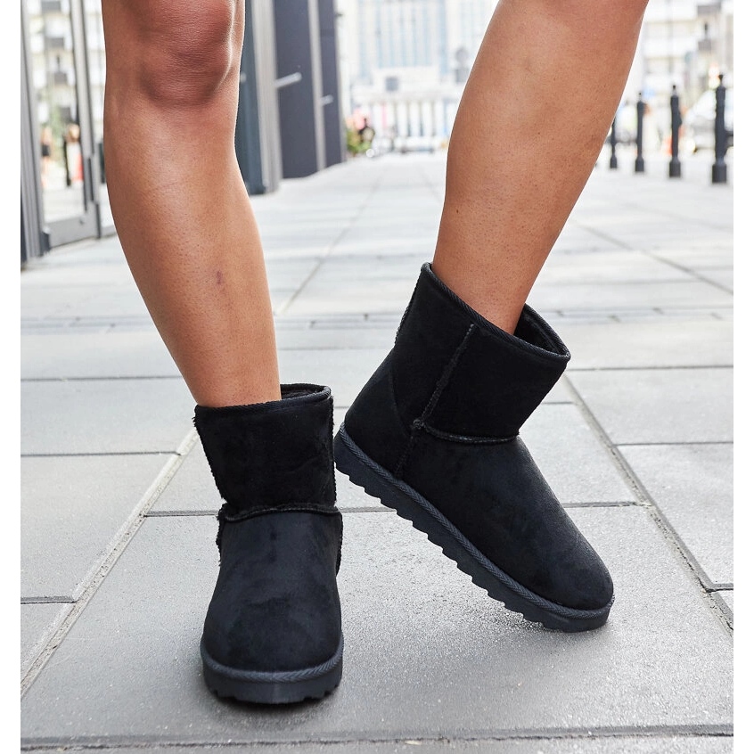 Cizmele de zăpadă sunt pantofi de iarnă pentru femei, îmbinând perfect practicitatea cu stilul la modă. Înălțimea pantofilor este de 18 cm, ceea ce garantează protecție împotriva frigului și zăpezii. Sunt confectionate din piele intoarsa ecologica neagra. Se caracterizează printr-o închizătoare cu alunecare și un deget rotund, iar aspectul lor constă într-un design neted, fără modele. Talpa este din cauciuc, tot neagra, iar tocul este o platforma inalta de 3 cm. În interior, pantofii sunt izolați cu blană delicată, moale, oferind protecție împotriva înghețului. În plus, cizmele de zăpadă au o inserție din material textil, sporindu-le și mai mult confortul.