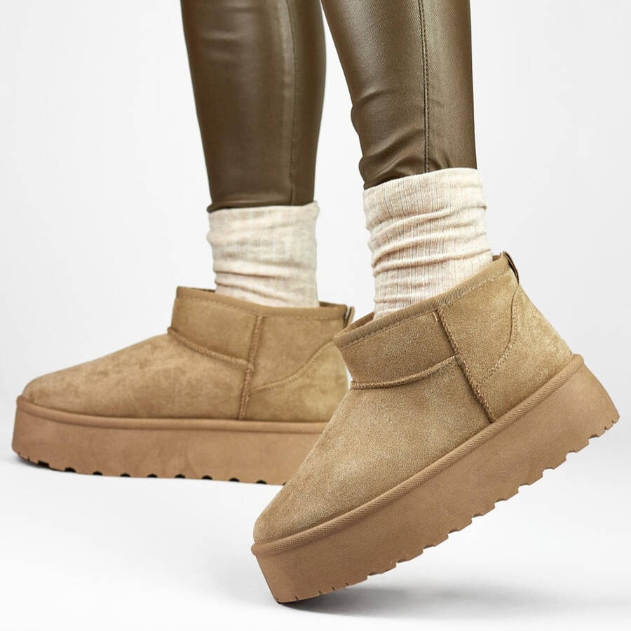 Cizmele de zăpadă pentru femei pe platformă în Dark Beige TL242-KH este alegerea perfectă pentru zilele reci. Fabricate din piele de căprioară ecologică, acestea oferă nu numai un aspect la modă, ci și confortul utilizării. Înălțimea superiorului de 9 cm și lățimea standard de 19 cm se adaptează perfect la picior, iar nasul rotund le oferă farmec.