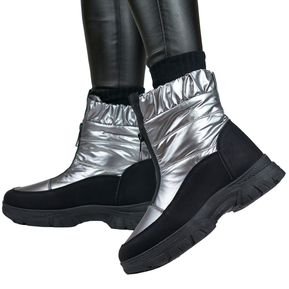 Cizme de zăpadă elegante, practice și calde pentru femei, într -o culoare neagră clasică, cu detalii metalice de argint. Perfect pentru toamnă și iarnă - oferă izolație înainte de frig, confort de purtare și stabilitate datorită platformei.