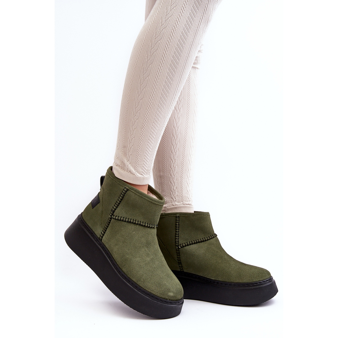 Cizme elegante și calde de zăpadă Maciejka, din piele naturală din piele de căprioară într -o nuanță la modă de măsline cu accente negre. Perfect pentru zilele reci - interiorul izolat cu o haină moale de piele de oaie oferă confort termic, iar călcâiul rigidizat stabilizează piciorul. Situate pe o platformă masivă, de cauciuc, cu o înălțime de 6,5 cm, acestea combină comoditatea cu un aspect urban și universal. Model alunecat, fără modele - atemporal și ușor de potrivit multe stiluri.