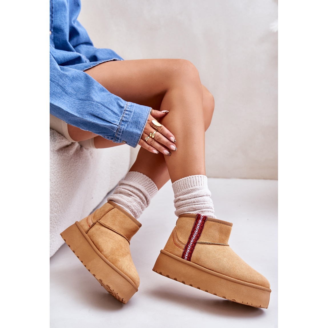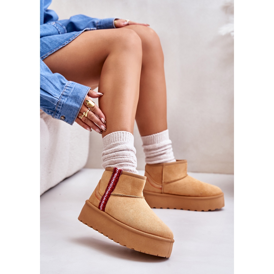 Pregătește-te pentru următoarele zile reci cu cizme de zăpadă cu platformă pentru femei la modă! Acești pantofi izolați bej cu model aztec sunt alegerea perfectă pentru femeile care doresc să îmbine stilul cu confortul. Partea superioară până la gleznă din piele de căprioară ecologică oferă nu doar un aspect elegant, ci și confort de purtare chiar și în zilele geroase, datorită blanii sintetice care izolează eficient căldura.