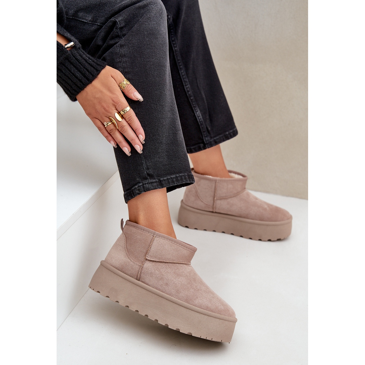 Cizmele de zăpadă sunt montate pe o platformă masivă, de 4 centimetri, realizată din material cauciuc, care asigură aderență solidă și confort în timpul purtării. Partea superioară până la gleznă și izolația din blană adaugă nu numai farmec, ci și funcționalitate, făcându-le o soluție ideală pentru zilele reci.