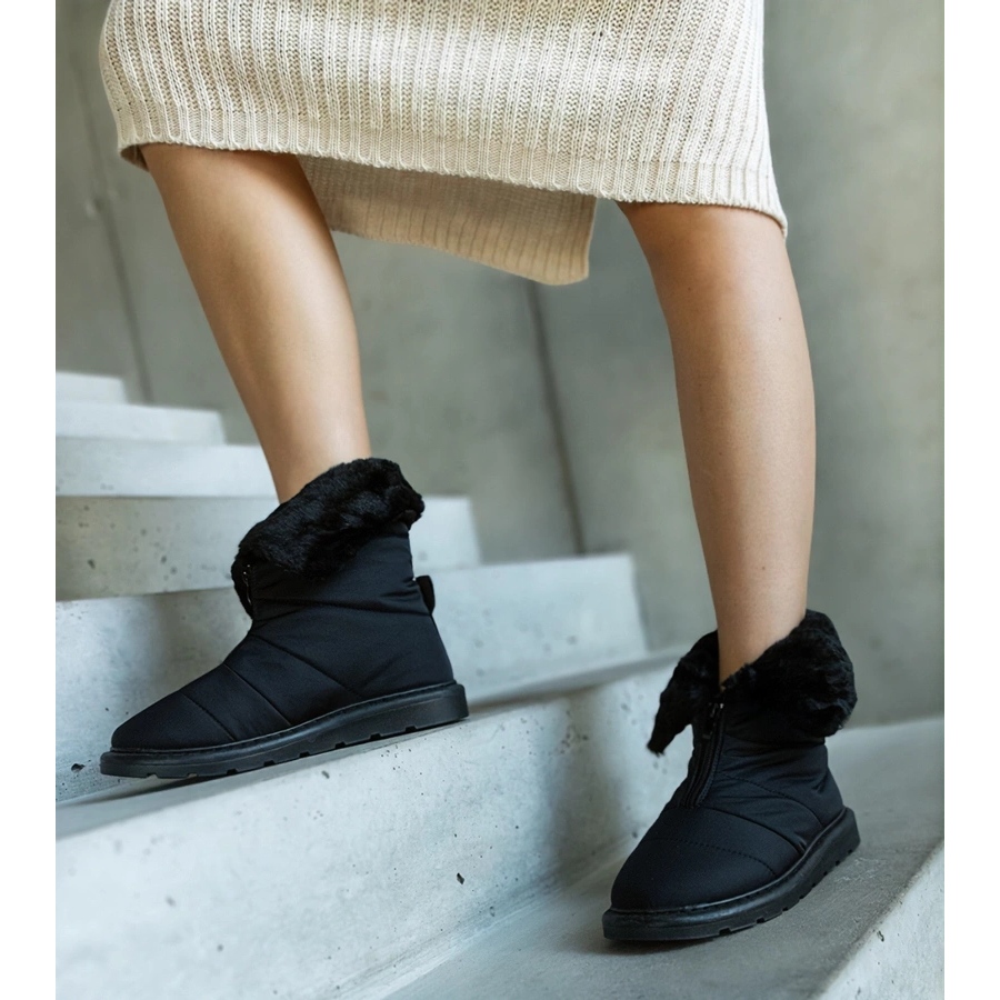 Datorită stratului suplimentar de blană, cizmele de zăpadă izolate Ediddda oferă confort termic, iar culoarea lor neagră universală le face să se potrivească cu multe stilizări de iarnă. Acest model se distinge printr -o tăietură înaltă și o platformă stabilă, cu o înălțime de 3,5 cm, ceea ce asigură nu numai confortul purtării, ci și optic prelungește picioarele. Fermoarul de pe partea laterală face mai ușor de pus pe ele, iar numerotarea standard face ca alegerea dimensiunii potrivite să fie simplă.