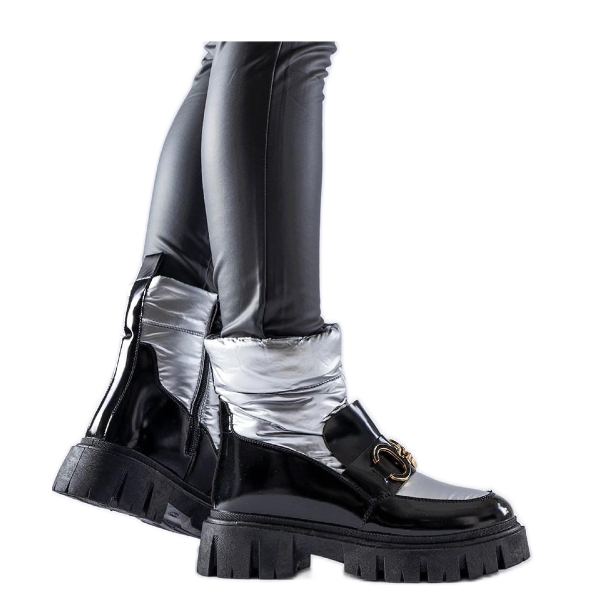 Cizmele de zăpadă lăcuite de negru și argintiu sunt soluția perfectă pentru fiecare femeie care dorește să combine stilul cu funcționalitatea în condițiile de iarnă. Acești pantofi eleganți de gleznă se caracterizează printr -un design unic, combinând o culoare neagră la modă cu accente subtile de argint.